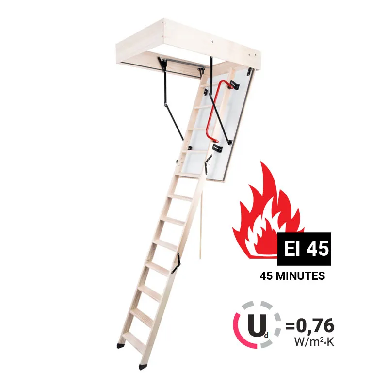 Чердачная лестница MAXI EI 45 имеет класс огнестойкости EI45, что означает 45-минутный предел сопротивления огню.