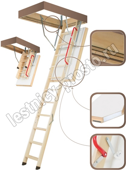 Деревянная чердачная лестница LWT оборудована суперэнергосберегающей крышкой белого цвета и коробом с тремя контурами уплотнения. Благодаря техническим параметрам данная модель лестницы обеспечивает высокую герметичность и минимальные потери тепла.