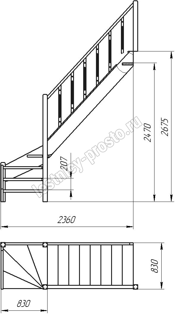 Деревянная межэтажная лестница ЛЕС-07 2470-2675 проем 2360-830, Лиственница