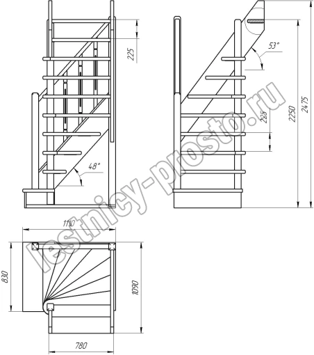 Деревянная межэтажная лестница ЛЕС-91 2250-2475 проем 1090-780, Сосна