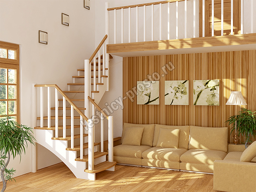 Ступени и поручень лестницы выполнены из дуба, остальные элементы из сосны. Возможно изготовление данной модели полностью из дуба.