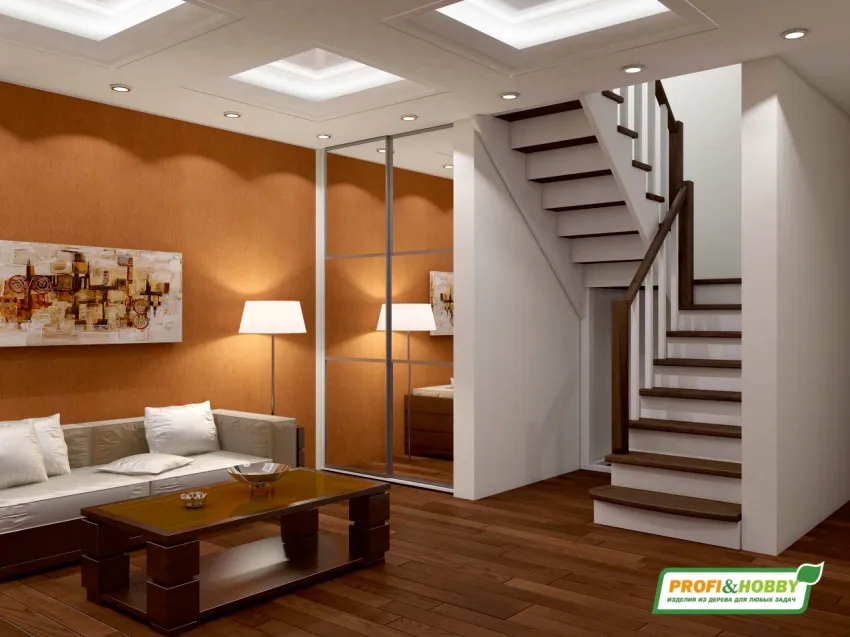 Базовый комплект включает в себя деревянные элементы лестницы и ограждения без какого-либо покрытия. Вы можете заказать у нас покраску лестницы в цвета, отвечающие особенностям вашего помещения.
