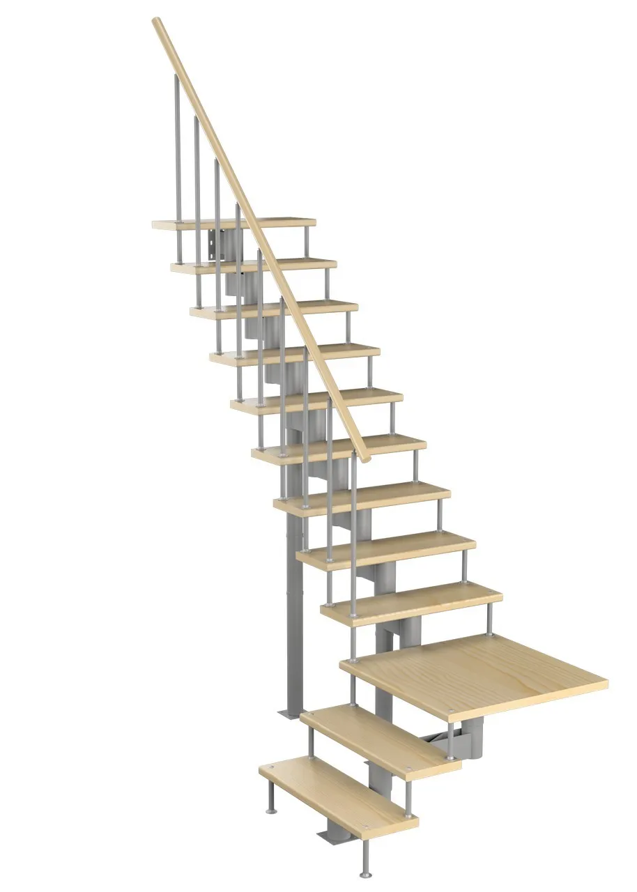В комплекте: 3 прямых столба и профильный поручень без покрытия, комплект из 3 ригелей из стали (окрашены в цвет каркаса или хром по желанию) диаметром 12 мм. Ограждение начинается со второй ступени.