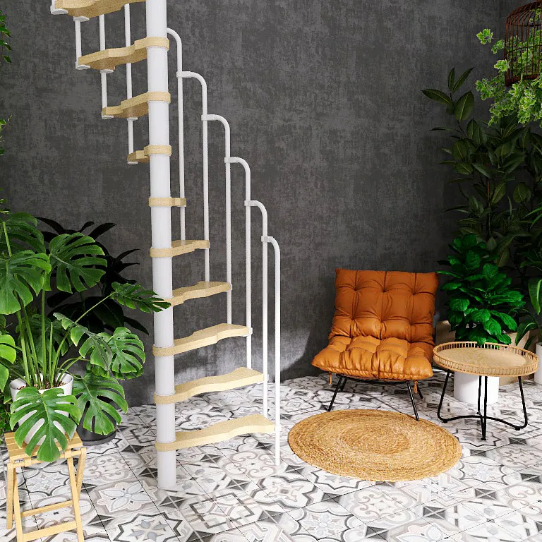 Новинка 2021 года !!! Не имеет аналогов в России по своему надежному конструктиву среди винтовых лестниц. Используемый материал - древесина шлифованная , не окрашенная и металл покрытый порошковой краской. Поручень - пластиковый, уже изогнутый. Цвет поручня в ассортименте.