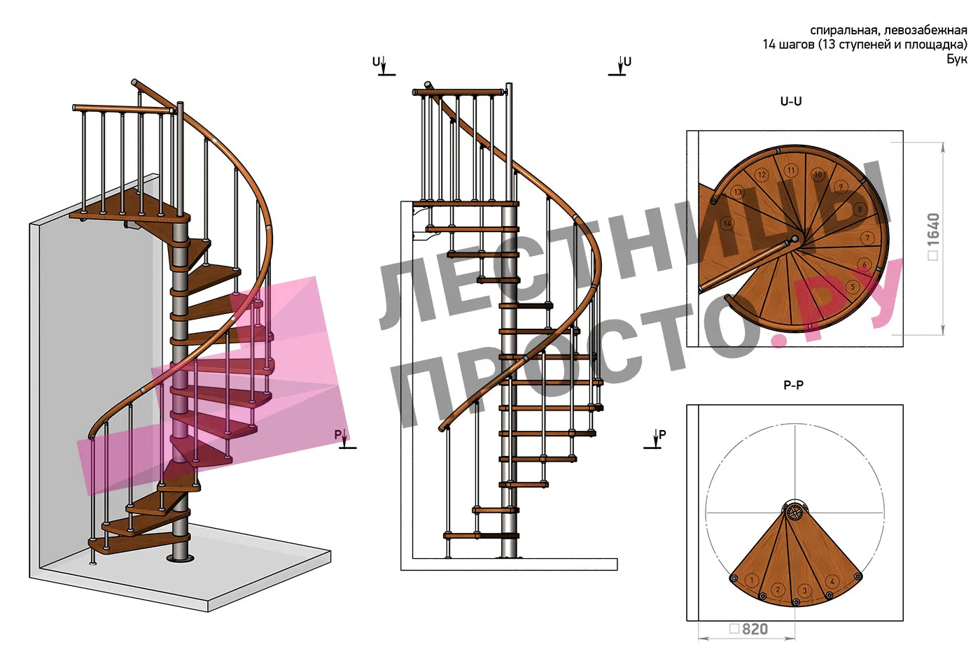 Левая, d=160см, 13 ступеней + площадка