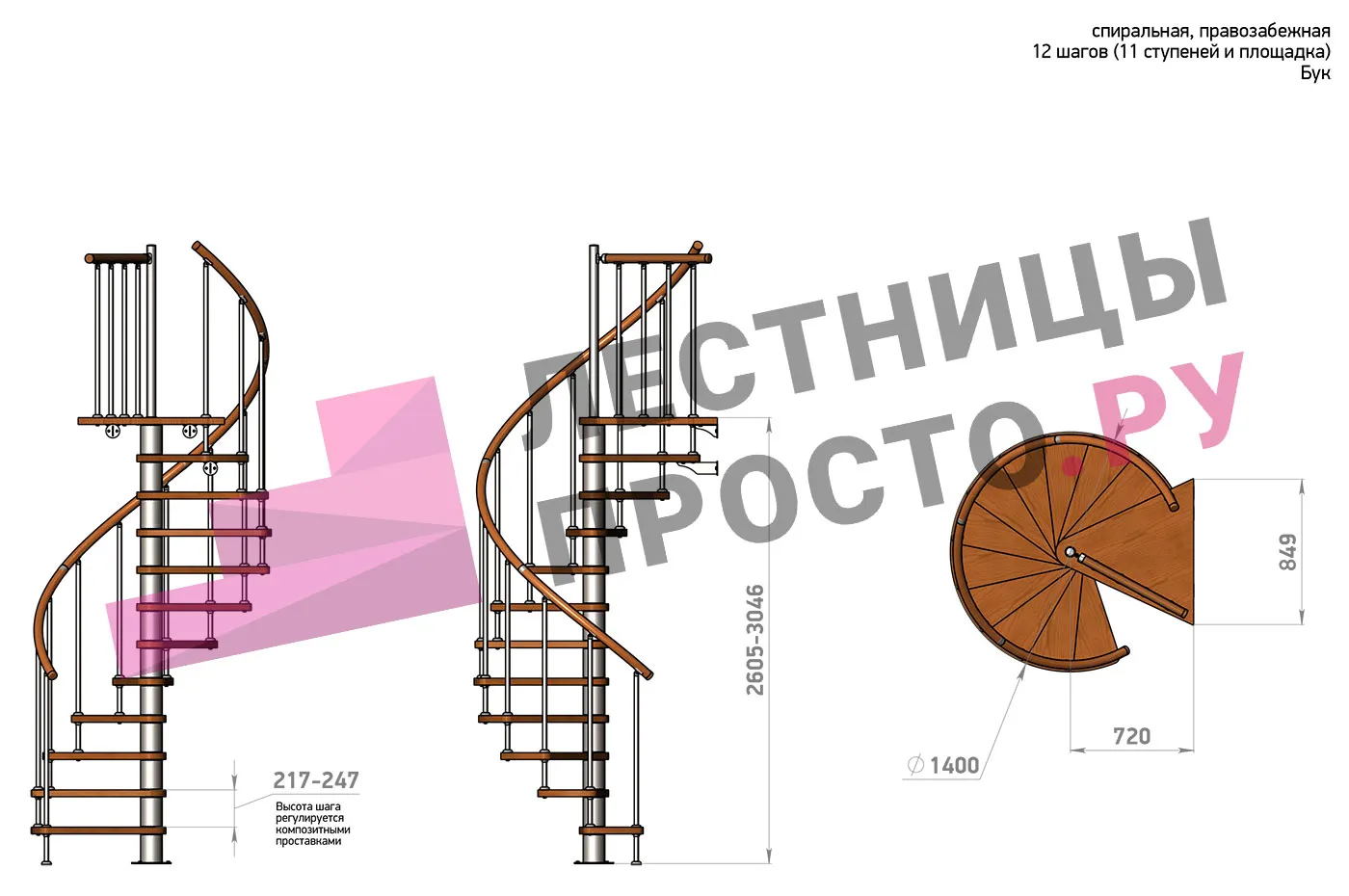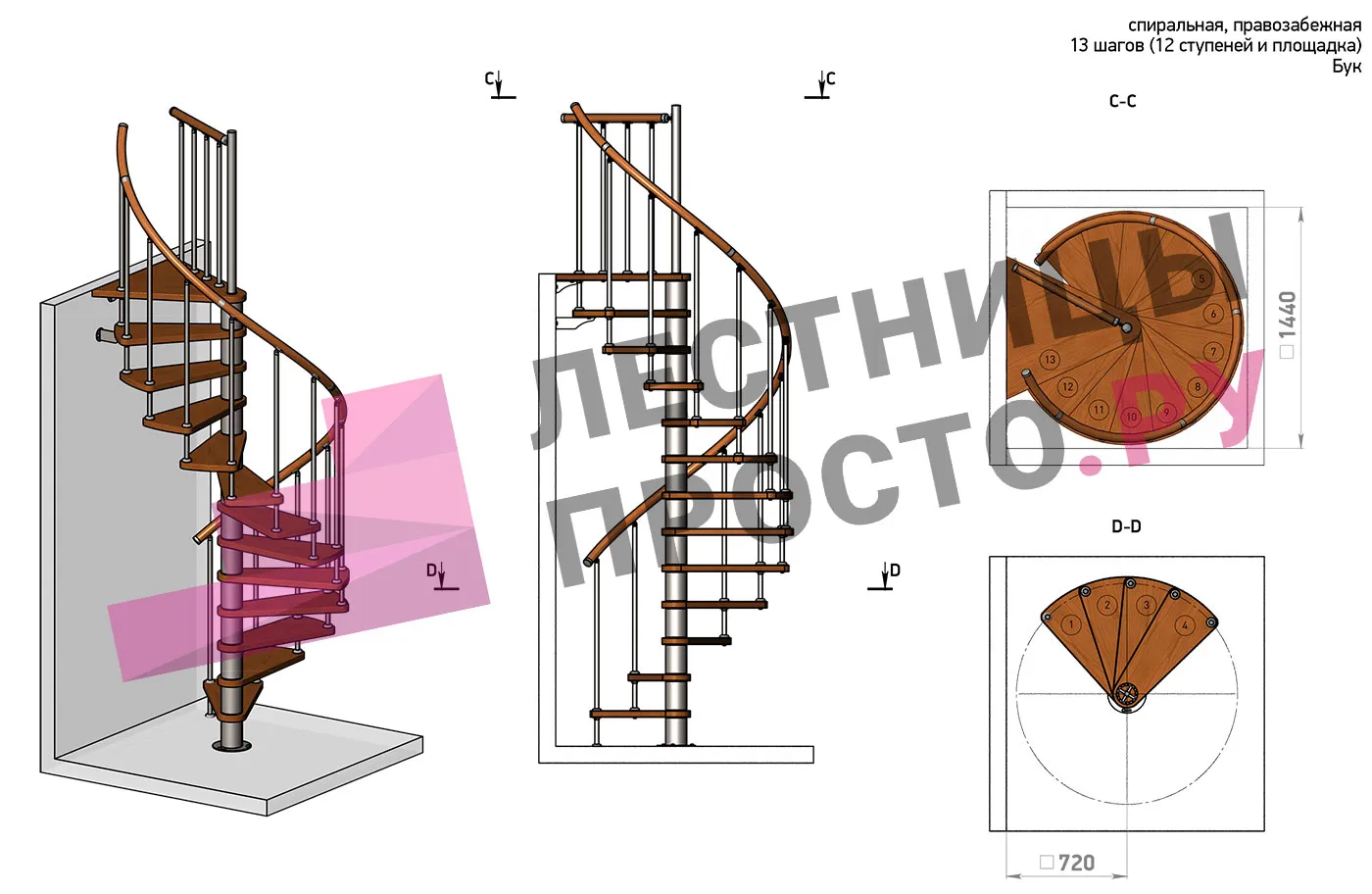 Правая, d=140см, 14 ступеней + площадка