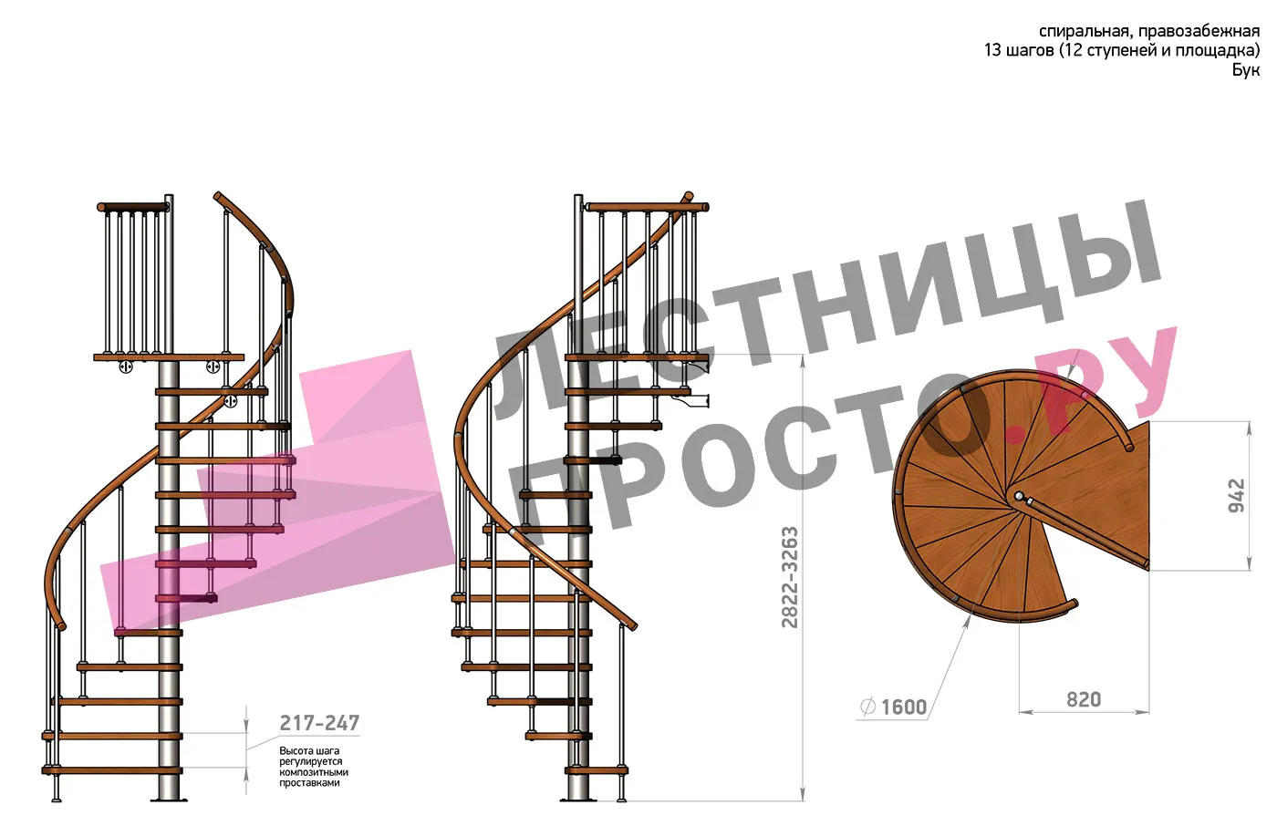 Правая, d=120см, 13 ступеней + площадка