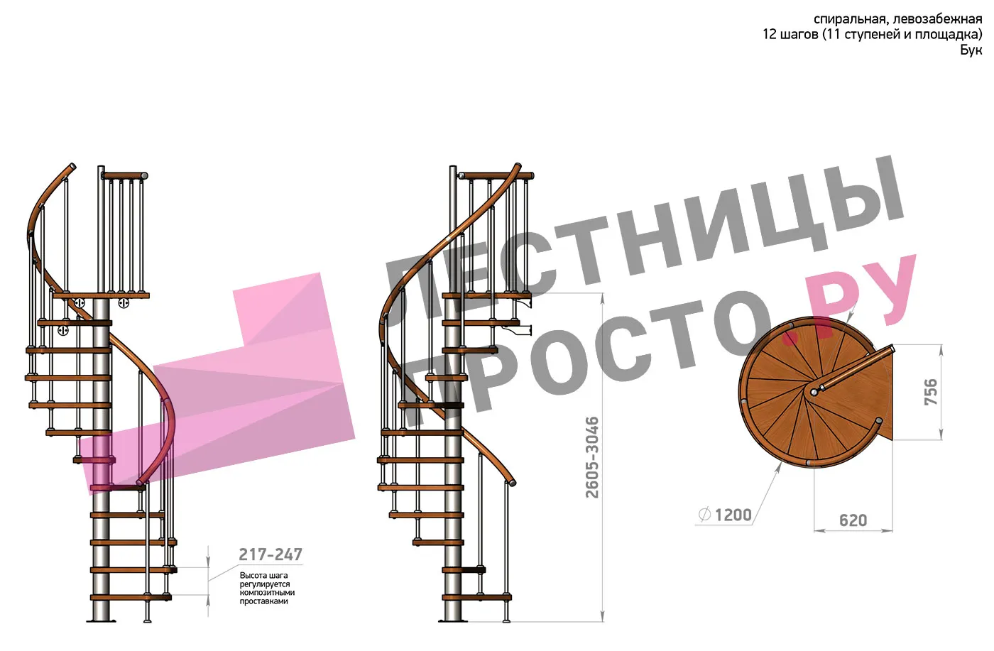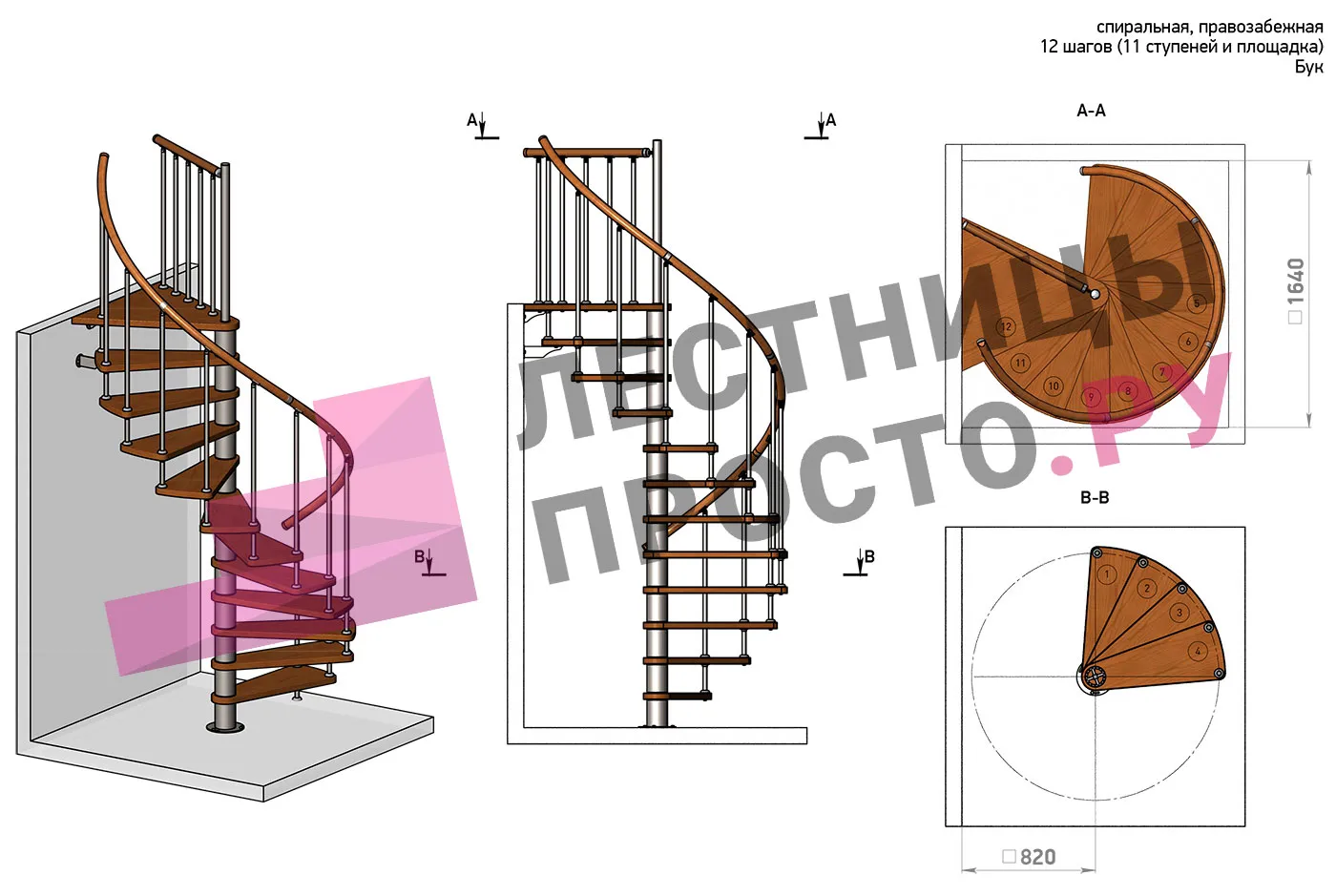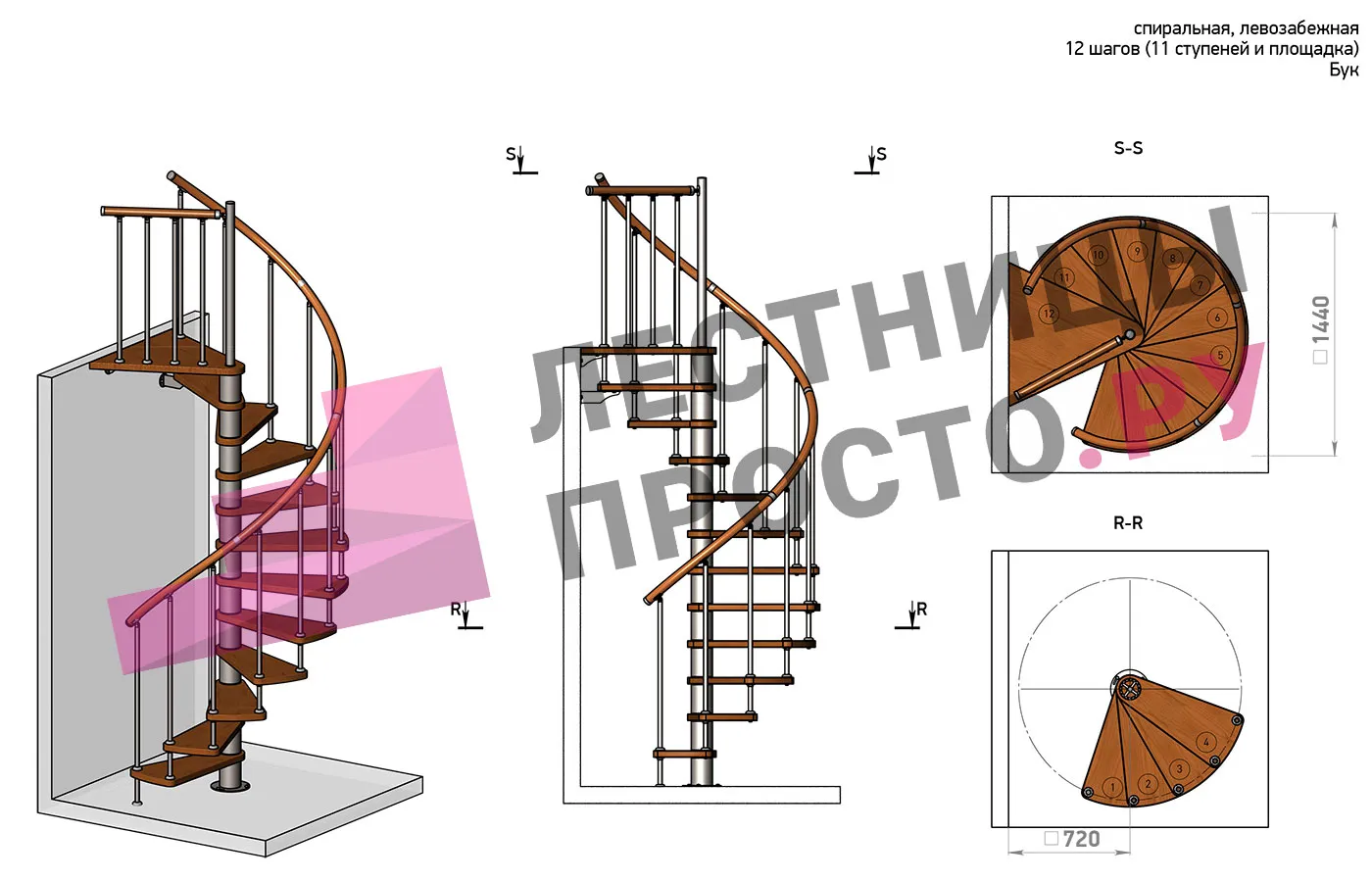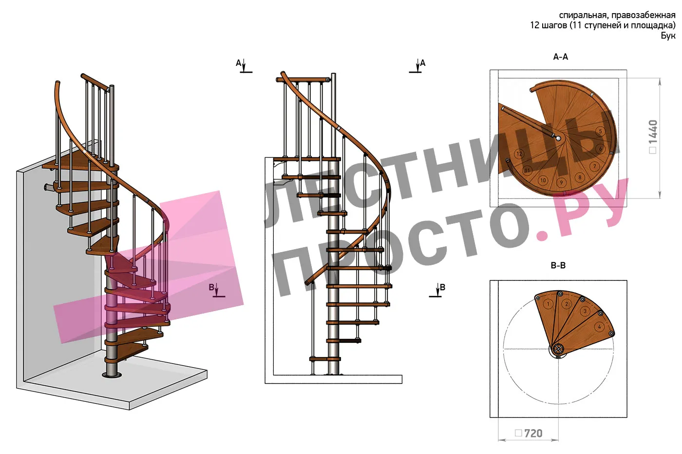Правая, d=120см, 12 ступеней + площадка