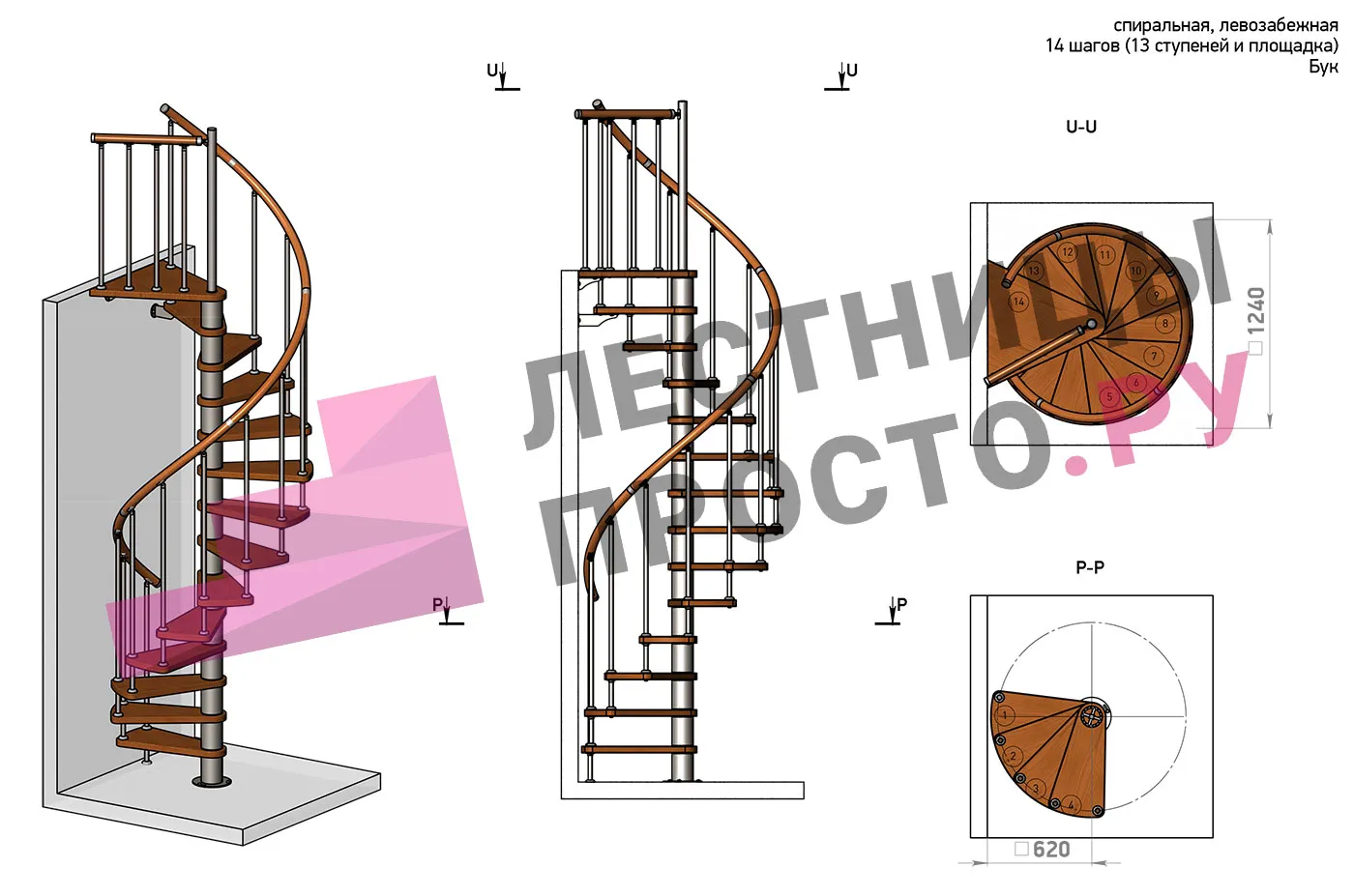 Левая, d=120см, 14 ступеней + площадка