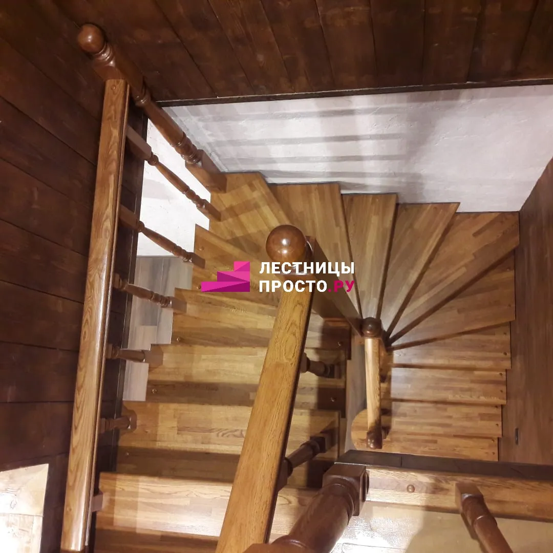 Лестница изготовлена из дуба паркетной склейки.